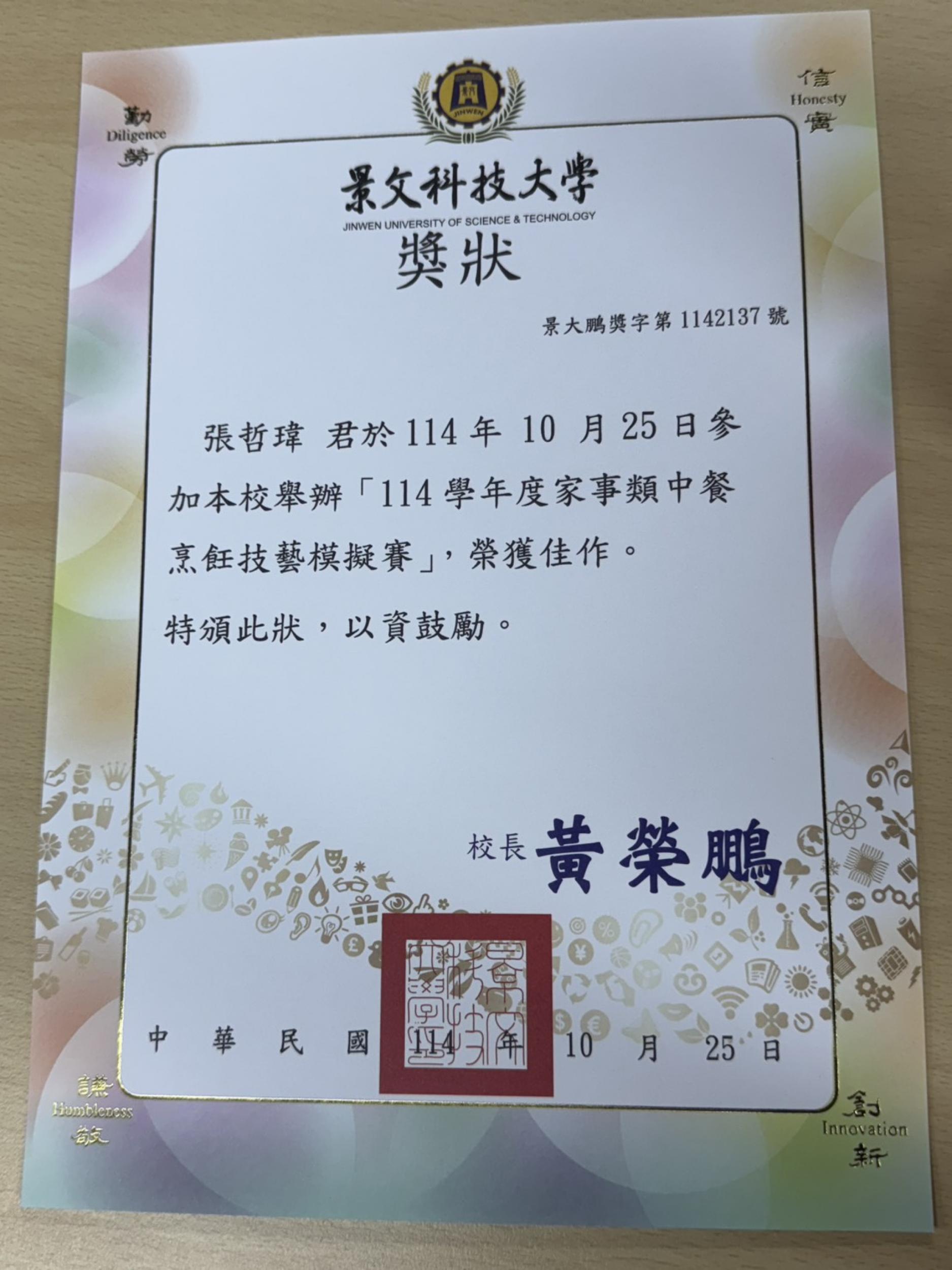 餐飲管理科!參加「114學年度家事類中餐烹飪技藝模擬賽」,榮獲「佳作」