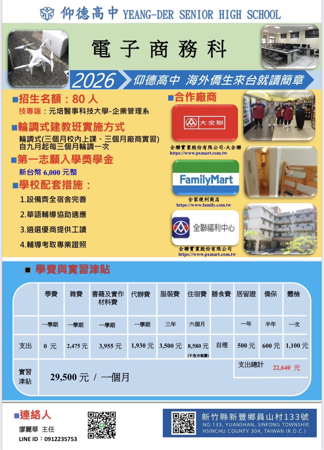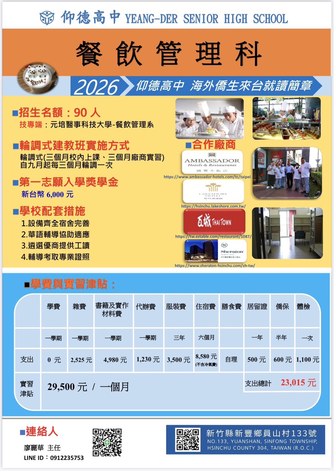 2026年仰德高中僑生班-餐飲管理科- 電子商務科簡章-中文版