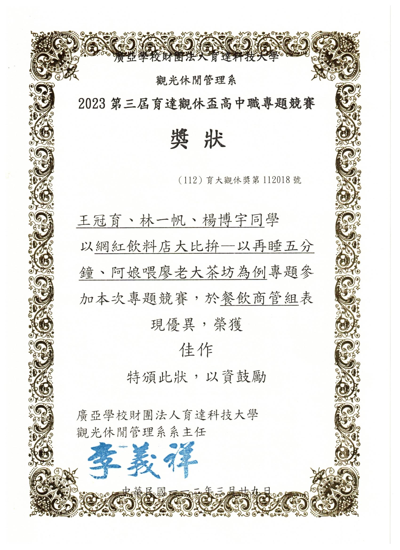 111-2 電商科 參加「第三屆 育達觀休盃」專題競賽,榮獲-佳作
