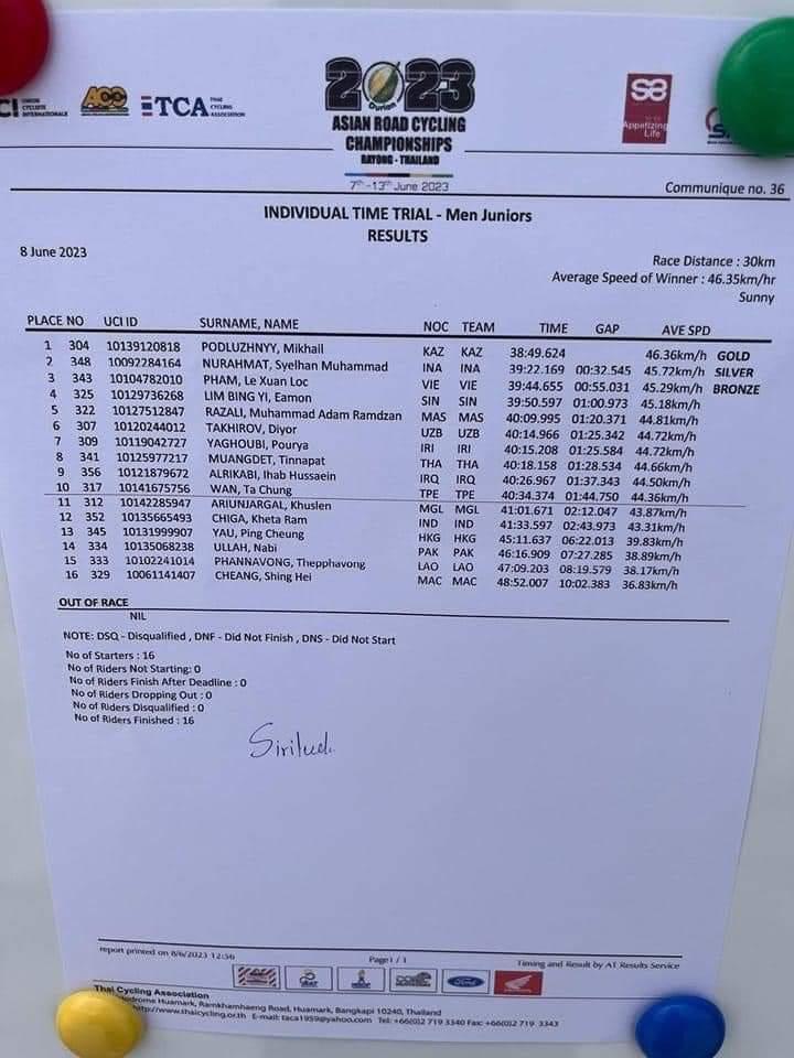賀 本校自由車隊萬○中選手參加2023泰國亞洲公路錦標賽青年男子個人公路計時賽獲得第10名