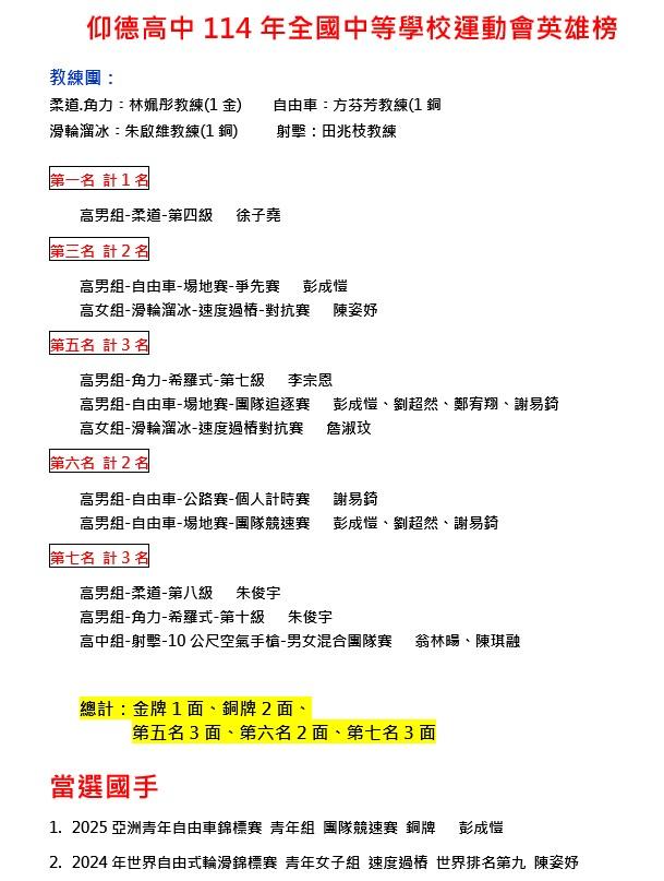 賀本校運動代表隊之114年全國中等學校運動會英雄榜.