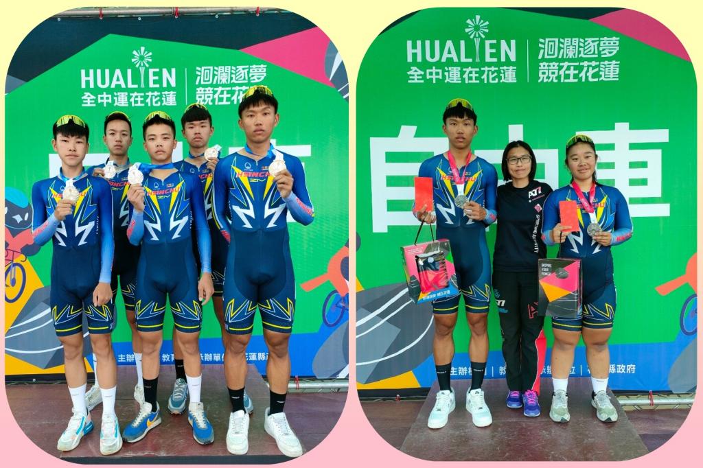 高男組自由車四公里團隊追逐賽 張O昇、謝O綺、朱O學、萬O中、姜O詠 榮獲銀牌